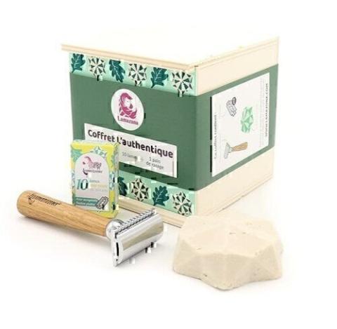 Coffret zéro déchet "L'authentique" LamazunaCoffret de rasage zéro déchet "L'authentique" de Lamazuna, les indispensables à offrir ou à s’offrir pour se faire plaisir avec des produits efficaces, mais surtout éco-conçus et made in France contenue dans une boite en bois de peuplier offerte !? Fini les bombes de mousse à raser avec le pain de rasage solide enrichi en beurre de karité, une crème moussante onctueuse pour un rasage tout en douceur, qui s'utilise avec une grande facilité et qui convient aussi bien aux femmes qu'aux hommes, parfum naturel thé vert et citron.? Rasoir de sûreté de barbier en bois de chêne avec peigne ouvert, pensé pour un maximum de sécurité. Facile à utiliser, pour un rasage agréable, traditionnel et rapide. Composé de bois de chêne français traité à l’huile de lin pour une résistance optimale à l’eau et de Zamak, un alliage de 5 métaux non ferreux (pour éviter la rouille). Il peut contenir une partie de matériau recyclé (env. 20%) > moteur de voiture, canette de soda pour l’aluminium ; matériaux de démolition pour le cuivre et le zinc. ? 10 lames en acier inoxydable et finition platine.Ce coffret en bois de peuplier français, zéro déchet garanti grâce à ce packaging léger, pratique et écologique !Coffret de rasage 100% zéro déchet1 coffret en bois de peuplier, 1 pain de rasage, 1 rasoir de sûreté de barbier et 10 lames en acier inoxydableLabel : Certifié par Ecocert Greenlife selon le référentiel COSMOSFabrication Française *Photo non contractuelle
