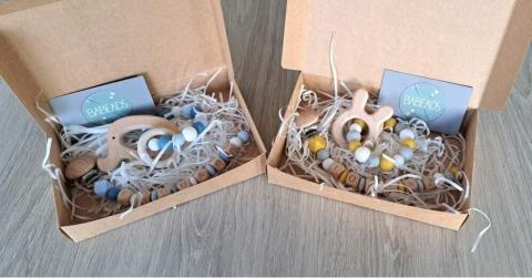 Coffret comprenant attache tétine et anneau de dentition avec prénom