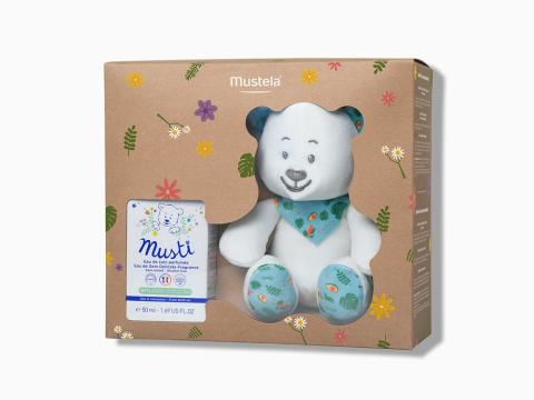 Découvrez le coffret parfum pour bébé et enfant. Avec l'Eau de soin Musti aux notes subtiles d’agrumes, de rose et de lilas. Sans alcool. Peluche OFFERTE 🧸