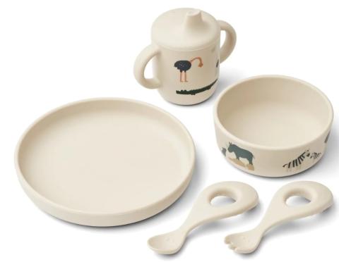 Set repas pour bébé en silicone. Il comprend: la fourchette Liva, la cuillère Liva, le gobelet Neil, le bol Iggy et l’assiette Olivia