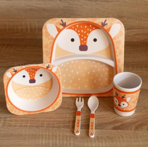Coffret 5 pièces : un bol, une assiette, une tasse, une cuillère et une fourchette.