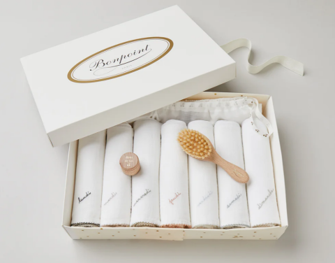 Ce coffret est composé du semainier iconique de 7 langes en coton doux, brodés d’un jour de la semaine de couleur distincte. Indispensables au quotidien du nouveau-né, ils sont complétés par la brosse à cheveux ainsi que la boîte à dents gravée, signature de la Maison, qui est offerte.