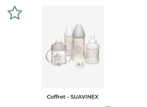Ce produit est extrait d'une liste de naissance déposée sur Kadolog. Kadolog permet de créer des listes de naissance en toute liberté. Il est possible d'ajouter toutes vos envies cadeaux et de recevoir les dons directement sur votre compte. Avec les dons reçus, vous êtes alors libre d'aller acheter vos produits (comme ce 'Coffret SUAVINEX ') où et quand vous le souhaitez.