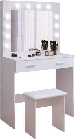 Coiffeuse avec miroir lumineux qui pourra ensuite servir de petit bureau en grandissant. Elle dispose d'un tiroir de rangement, elle est moins chère que la plupart des coiffeuses similaires que l'on trouve en ligne et il est possible de personnalisé avec des stickers pour la rendre plus enfantine.