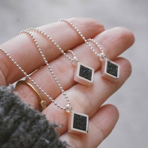 Pendentif fait main en argent en forme de losange avec pierre d'onyx naturelle cristallisée taillée dans la même forme. La face visible de la pierre, avec ses micro-cristaux caractéristiques, est telle qu'on la trouve dans la nature, et selon la façon dont on la déplace et la lumière qui la frappe, elle génère des étin