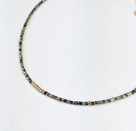 Collier plaqué or 24 carats. • Pierres turquoises africaines • Longueur : 38 cm + 3 cm de chaînette de réglage Fabriqué artisanalement en France dans nos ateliers.