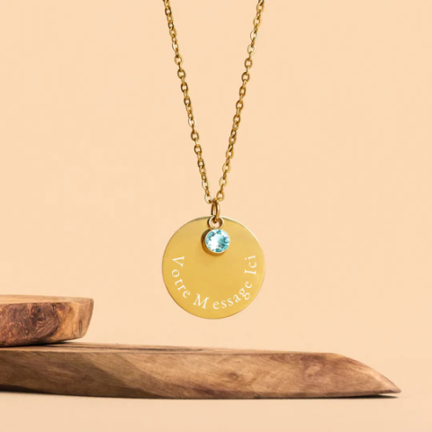Gravez votre Collier Médaillon Plaqué Or 18 Carats ou Argent, avec un message personnalisé. Choix de cinq Cristaux Swarovski colorés. Un Bijou Unique !