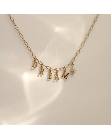 Par exemple, si vous souhaitez le collier DREAM, vous devez sélectionnez l'option 5 lettres + 1 charm (70€) et mentionner en commentaire qu'il s'agit de ce collier.