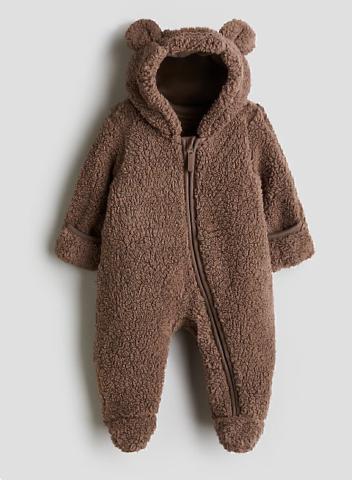 Combi-pilote en tissu peluche doux avec capuche agrémentée d'oreilles appliquées. Modèle avec fermeture à glissière surmontée d'un protège-menton anti-irritations devant. Bord dépliable en bas de manche pour garder les mains au chaud et pieds fermés. Doublure en jersey.