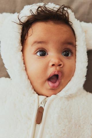 Combi-pilote en tissu peluche doux avec capuche agrémentée d'oreilles appliquées. Modèle avec fermeture à glissière surmontée d'un protège-menton anti-irritations devant. Bord dépliable en bas de manche pour garder les mains au chaud et pieds fermés. Doublure en jersey.