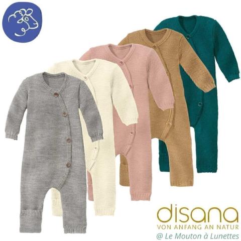 Combinaison bébé tricotée en laine mérinos bio de la marque Disana. Pratique comme vêtement de jour comme de nuit. Avec revers aux pieds.