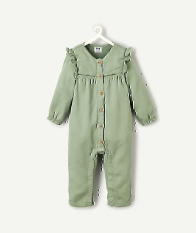 Voici la combinaison parfaite pour votre petite aventurière! Confortable et tendance, cette combinaison verte à manches longues est idéale pour toutes les occasions. Les boutons en bois et les volants ajoutent une touche de charme irrésistible.