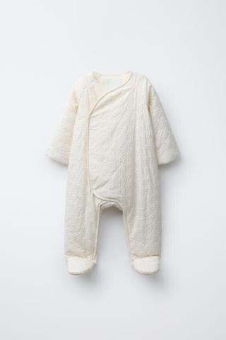 Combinaison matelassée à col rond et manches longues. Fermeture croisée sur le devant avec boutons-pression invisibles. Détail de broderies de fleurs.