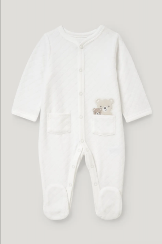 Combinaison pour bébé en velours doux avec motif texturé. Patte de boutonnage continue et deux poches plaquées. Écusson ourson et pieds.