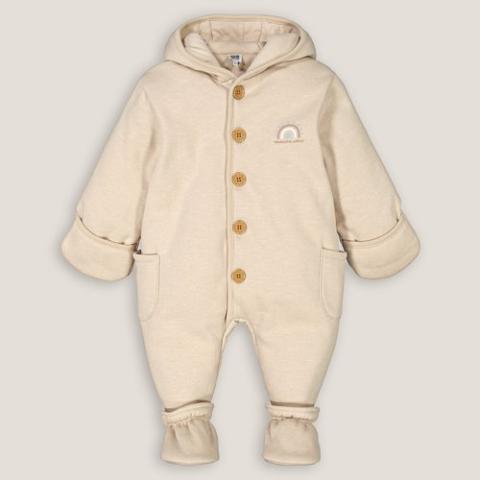 Combipilote à capuche en molleton. Capitonnée, elle est doublée jersey pur coton pour encore plus de douceur. Moufles intégrées.