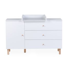 Childhome - Commode 4 tiroirs - Combinaison élégante d’éléments en bois blanc et massif - Comprend 3 tiroirs et une armoire avec deux étagères pour un grand rangement - L’unité à langer pratique peut être retirée au fur et à mesure que votre enfant grandit, ce qui prolonge la facilité d’utilisation - Les tiroirs sont équipés d’un système de fermeture douce pour éviter de réveiller votre bébé.