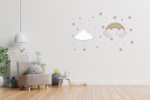 Composition murale en bois pour chambre d’enfant, alliant douceur, poésie et élégance avec veilleuse.