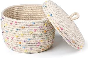 Winter Shore Panier Rangement avec Couvercle - Corbeille Rangement Décorative pour Plantes, Jouets, Bébés, Collations, Linge - Panier en Corde de Coton Tissé - Crème & Points Colorés 16 x 25 cm : Amazon.com.be: Cuisine et maison