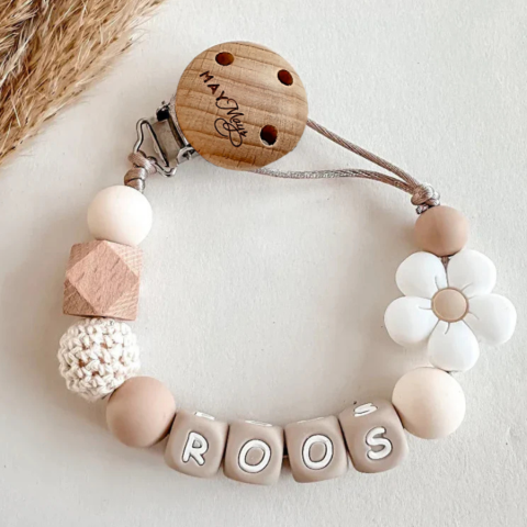 Attache-tétine personnalisée avec un prénom et une fleur blanche. Fait main, sûr et toujours joliment emballé. Un cadeau de maternité intemporel et personnalisé de May Mays. Un acheté, un offert.