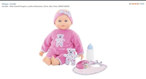 Ce produit est extrait d'une liste de cadeaux (Anniversaire, Noël, ...) déposée sur Kadolog. Kadolog permet de créer des listes de cadeaux (Anniversaire, Noël, ...) en toute liberté. Il est possible d'ajouter toutes vos envies cadeaux et de recevoir les dons directement sur votre compte. Avec les dons reçus, vous êtes alors libre d'aller acheter vos produits (comme ce 'Corolle LUCILLE ') où et quand vous le souhaitez.