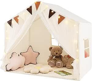 COSTWAY Tente de Jeux Enfant avec Rideaux en Tissu & Moustiquaire, Cabane Enfant Intérieure avec Guirlandes Lumineuses Étoiles & Fanions à Carreaux, Tapis Lavable, Maison de Jeux pour 3 Ans+ : Amazon.com.be: Jouets