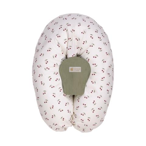 Coussin Multirelax Candide Cerises multifonction à utiliser pendant la grossesse, l'allaitement et en transat pour bébé. Déhoussable.