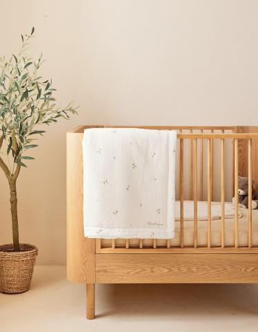 Offrez à bébé un cocon de tendresse avec cette couverture double face : une gaze de coton BIO écru légère d’un côté et d'une sherpa blanche toute moelleuse de l’autre. Elle est délicatement brodée de motifs végétaux et du logo Noukie’s en camel, pour une touche raffinée et chaleureuse à chaque instant.