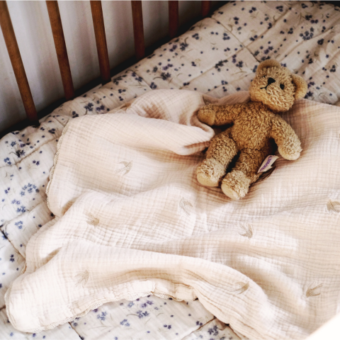 ROMANTIQUE À SOUHAIT, Dites bonjour à nos charmants oiseaux, toujours en balade, joyeux et libres…  Charmante couverture nomade bébé brodée d'hirondelles, en gaze de coton toute douce. Vous allez adorer ce motif merveilleux composé de 36 hirondelles qui dansent la joie ! Son coloris écru est un intemporel, une couleur