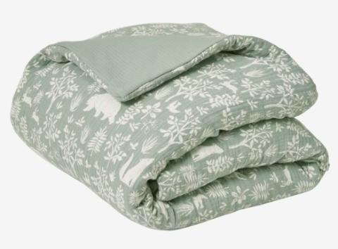 Un tapis délicat par son jeu de matières (une face gaze de coton, une face en jersey côtelé) et par les motifs qui le recouvrent. Son style tendrement scandinave offre beaucoup de douceur à la déco. Bébé pourra s'y installer pour jouer et faire de merveilleuses découvertes !