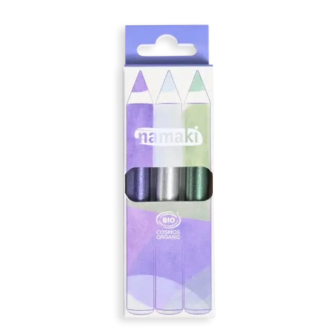 Le kit trois couleurs Nuit accompagnera les rêves les plus doux. Avec les crayons de maquillage pailletés vert, violet et argent, télétransportez-vous dans un monde de neige et de glace où la voûte céleste s'illumine en couleurs.
