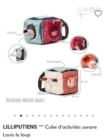 Découvrez le cube d'activités sonore Louis de la marque Lilliputiens. Pleins de motifs et textures différents pour éveiller les sens de votre bébé !