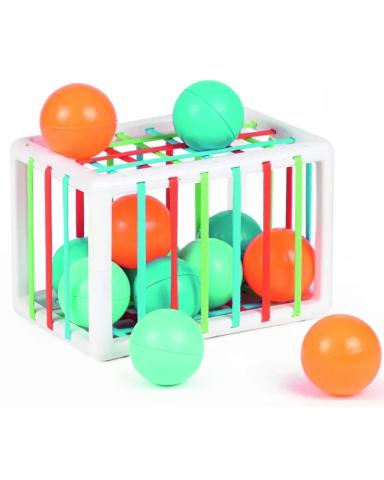 CUBE DE MANIPULATION 12 BALLES 12 balles de matières différentes à faire entrer dans ce cube dont les faces sont remplies d'élastiques. Idéal pour développe...