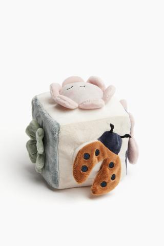 Peluche interactive en forme de cube légèrement matelassées, dont certaines agrémentées d'applications produisant des bruits de froissement, et miroir.