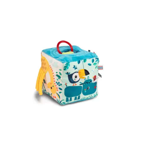 Un cube sonore remplie d'activités pour les petits dès 9 mois ! 7 sons d'animaux différents, un miroir, un anneau de dentition, et plein d'autres surprises. Éveille les sens et la motricité des tout-petits.