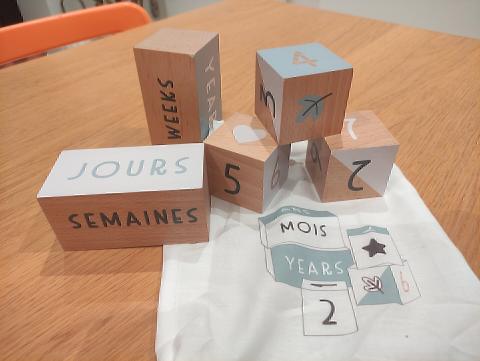 Cubes en bois qui serviront à prendre des photos à chaque âge. Achetés en seconde main.