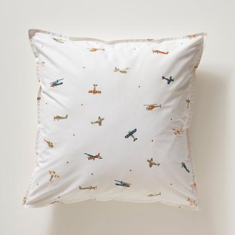Avions, hélicoptères et petites étoiles s'envolent sur cette taie d'oreiller au style rétro chic. Un imprimé exclusif dessiné par nos stylistes. Dos coloris ivoire avec petites étoiles coloris caramel. Rabat 20 cm. Volant plat 1 cm