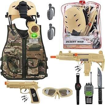 deAO Ensemble de Costume Militaire Camouflage désert avec Casque, Fusil, Grenades, Accessoires Militaires et Un Sac à Dos de Rangement : Amazon.com.be: Jouets