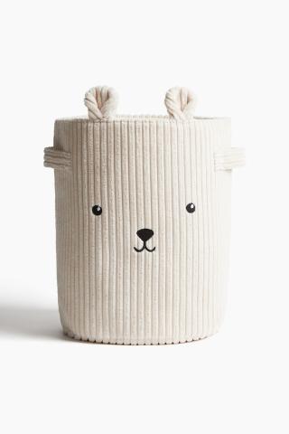 Panier de rangement en doux velours à grosses côtes. Modèle avec oreilles appliquées et adorables éléments de visage brodés devant. Poignées latérales pour faciliter le transport.