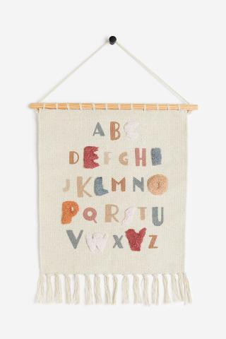 Décoration murale en coton tissé avec motif alphabet devant et longues franges à la base. Modèle avec baguette en pin munie d’un cordon textile en haut pour une suspension facile. Visserie non incluse...