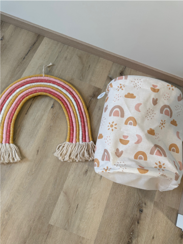 1 arc-en-ciel mural & 1 panier achetés chez Maison du monde. Juste pour rendre sa chambre mignonne :)