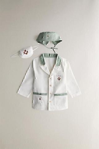 Déguisement de vétérinaire pour enfant comprenant une blouse, un masque et un bonnet assortis.