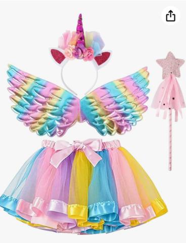 Le déguisement Licorne comprend une jupe buste, des ailes colorées, Le bâton magique des étoiles et un cerceau de tête Licorne.