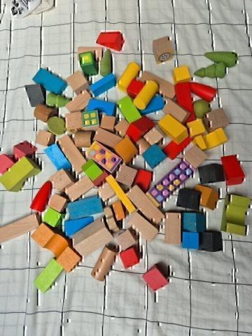 Un lot de jolis blocs en bois Goki, trouvé en seconde main, pour des heures de jeux et d'imagination
