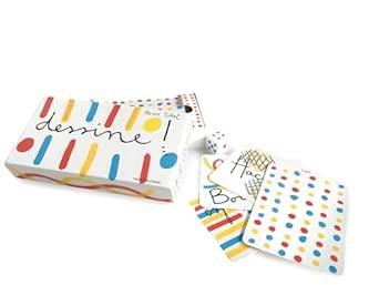 Le jeu contient : 30 cartes "Quoi dessiner ?", 30 cartes "Comment dessiner ?", un dé, des pochoirs, une régle du jeu.