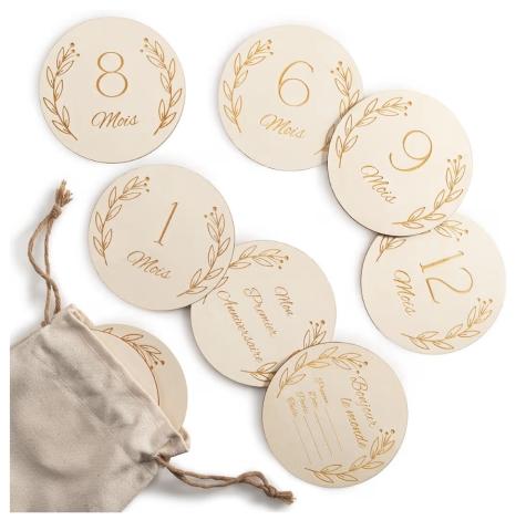en toute liberté. Il est possible d'ajouter toutes vos envies cadeaux et de recevoir les dons directement sur votre compte. Avec les dons reçus, vous êtes alors libre d'aller acheter vos produits (comme ce 'Disques en bois - étapes bébé