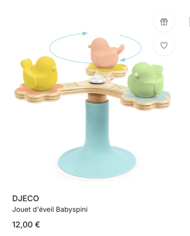 en toute liberté. Il est possible d'ajouter toutes vos envies cadeaux et de recevoir les dons directement sur votre compte. Avec les dons reçus, vous êtes alors libre d'aller acheter vos produits (comme ce 'Djeco - Jouet d'éveil Babyspini | Smallable