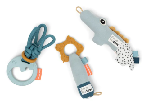 Les bébés commencent à développer très tôt leur motricité fine. Le coffret Done by Deer offre trois hochets pour les éveiller et les aider dans leur développement. Le premier, le hochet sensoriel, est parfait de 2 à 4 mois avec un accent particulier sur la stimulation des mouvements incontrôlés. Les deux autres seront idéaux de 3 à 5 mois pour soulager les gencives douloureuses lors des poussées dentaires grâce à leurs anneaux de dentition.