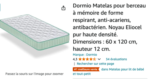 Ce produit est extrait d'une liste de naissance déposée sur Kadolog. Kadolog permet de créer des listes de naissance en toute liberté. Il est possible d'ajouter toutes vos envies cadeaux et de recevoir les dons directement sur votre compte. Avec les dons reçus, vous êtes alors libre d'aller acheter vos produits (comme ce 'Dormio Matelas pour berceau à mémoire de forme respirant, anti-acariens, antibactérien. Noyau Eliocel pur haute densité. Dimensions : 60 x 120 cm, hauteur 12 cm. : Amazon.com.be: Bébé et Puériculture ') où et quand vous le souhaitez.