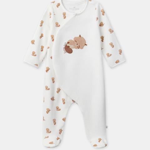 Dors-bien en velours composé de coton issu de l'agriculture biologique eux velours uni et imprimé Castor en patch velours sur le buste et finitions brodées dans les tons beige, café au lait et chocolat Inscription brodée "Bonne nuit" Ouverture arrondie à l'avant avec boutons pression invisibles Velours avec imprimé cas