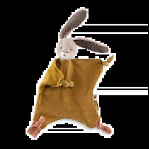 Découvrez le doudou lapin Ocre de Moulin Roty. Plat, carré et doté de longues oreilles douces, ce doudou est parfait pour les petites mains de votre enfant.